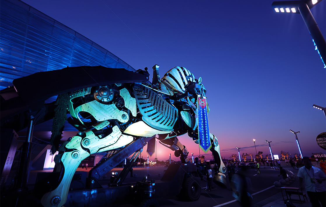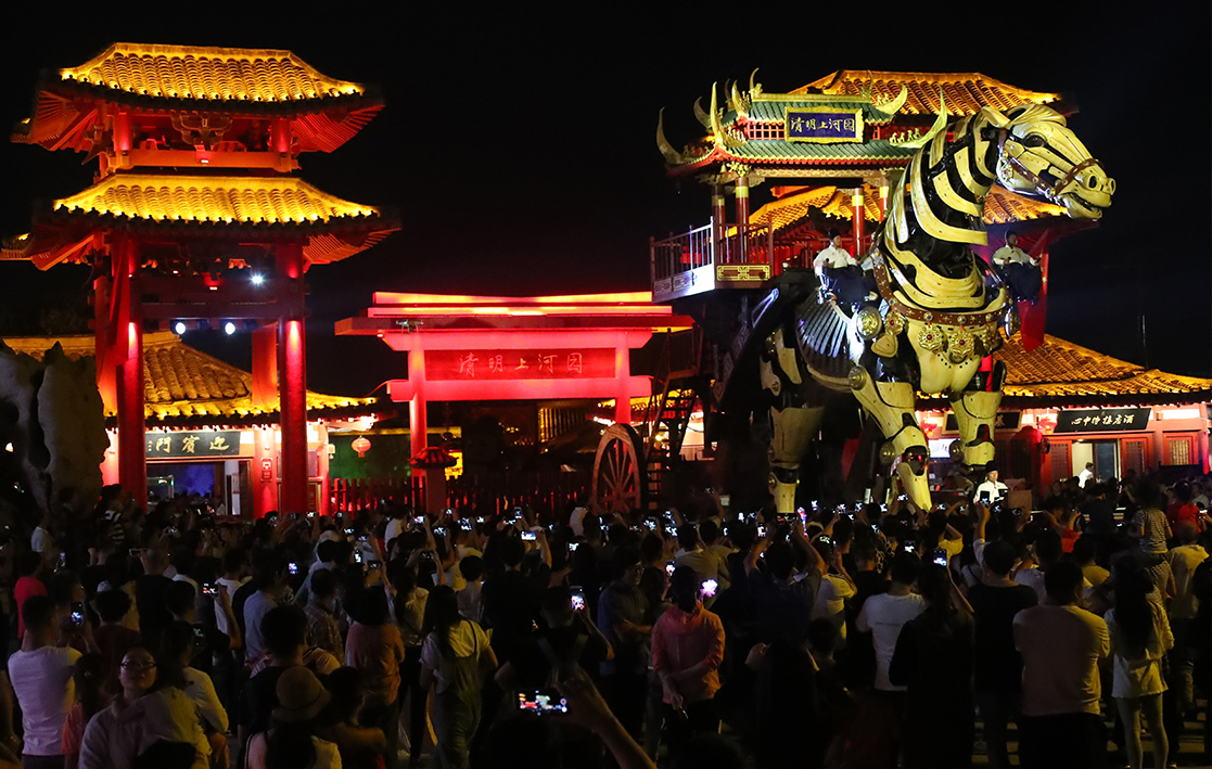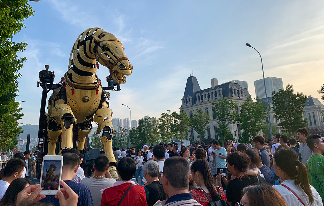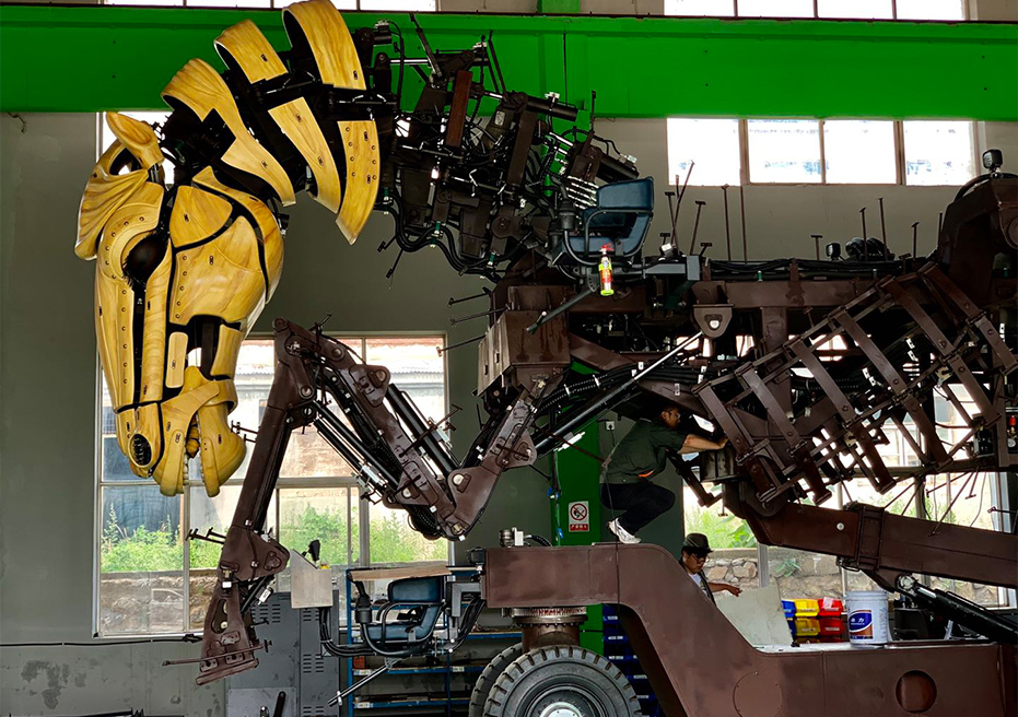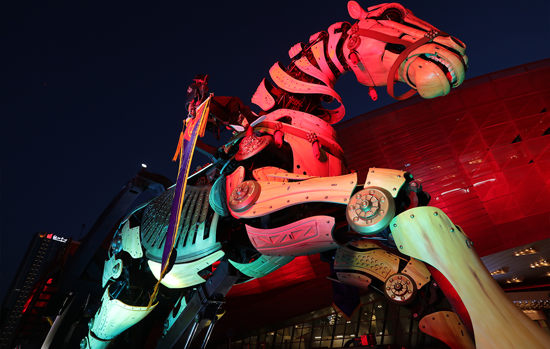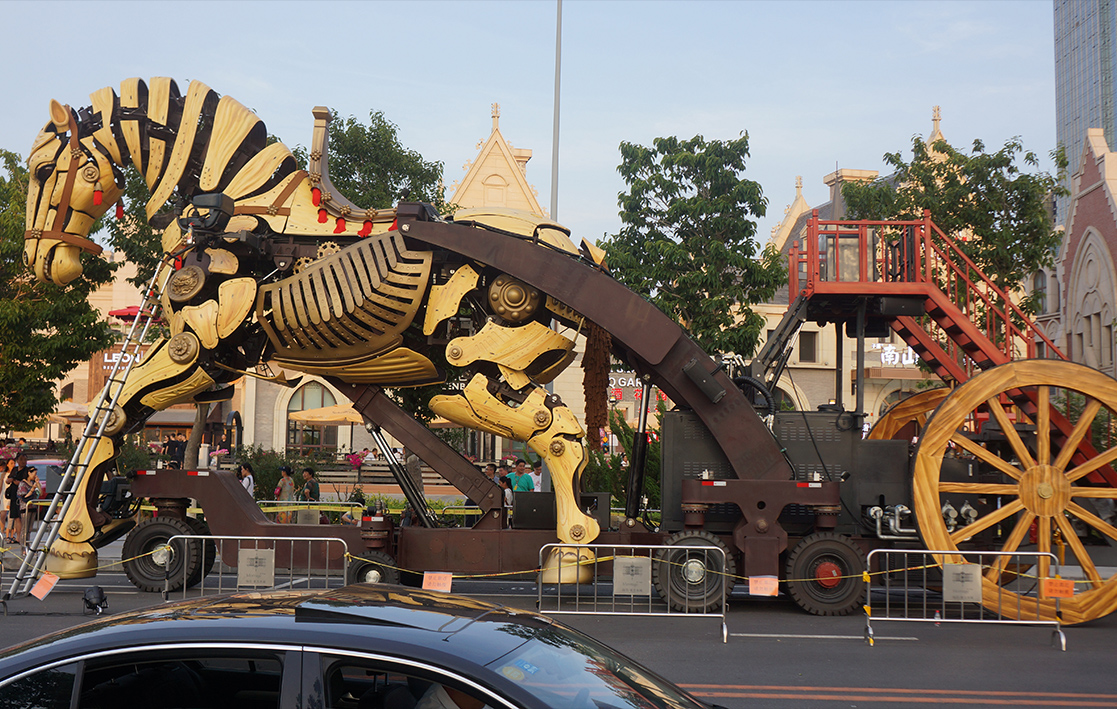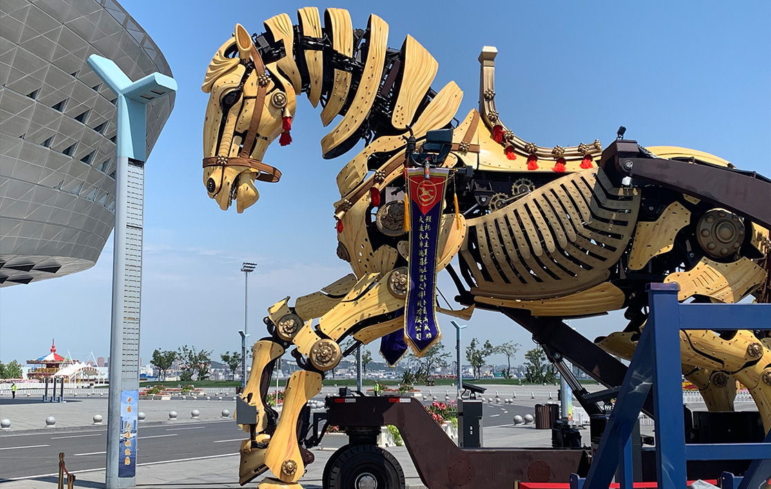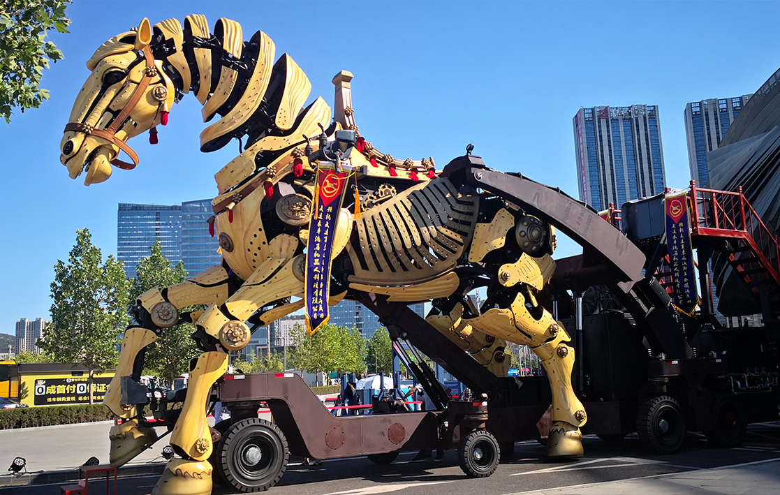 With its mechanical structure as the core, it vividly recreates a living horse that can walk, leap, raise its head, wag its tail, and make bionic gestures with its abdomen and facial features. Its neighing and water and mist spraying effects enable interaction with tourists.