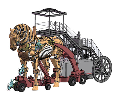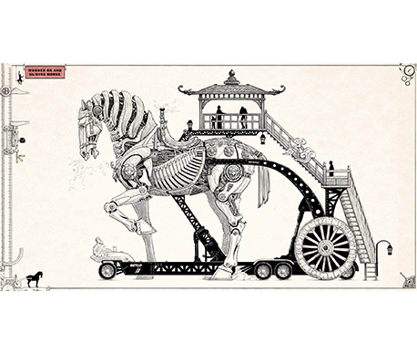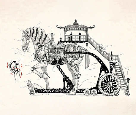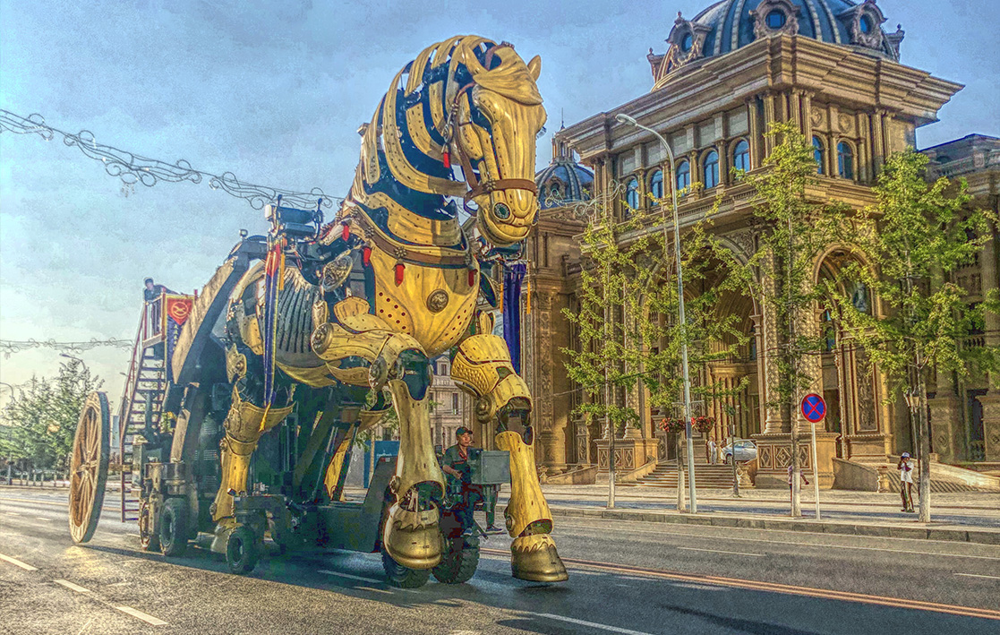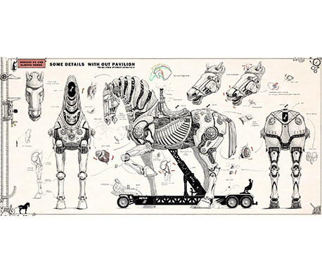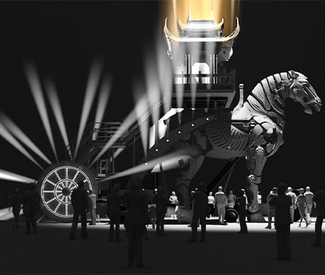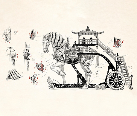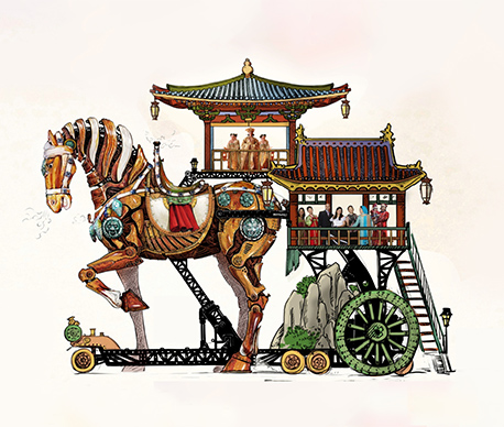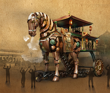 The mechanical horse parade vehicle adopts the traditional Chinese shape with elements from the Tang tri-color glazed ceramics. Combining the trendy steampunk style, mirroring the transmission principle of marionettes, and applying modern mechanical transmission techniques, the work sets to create a steampunk exclusive to the Chinese.