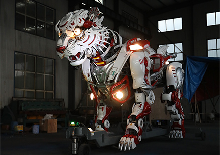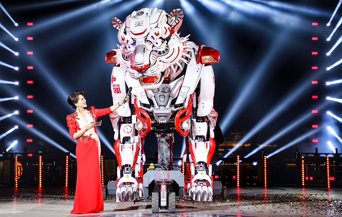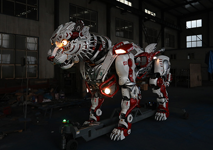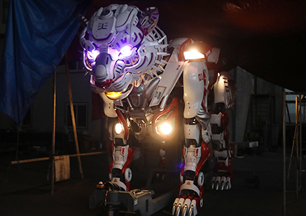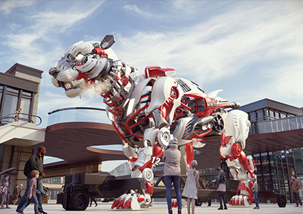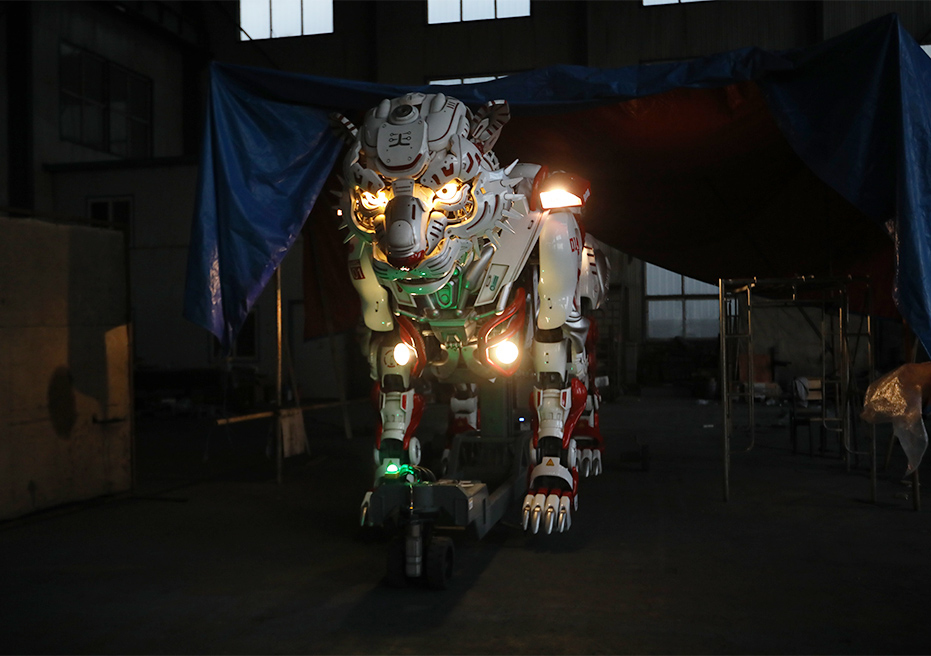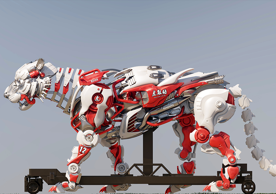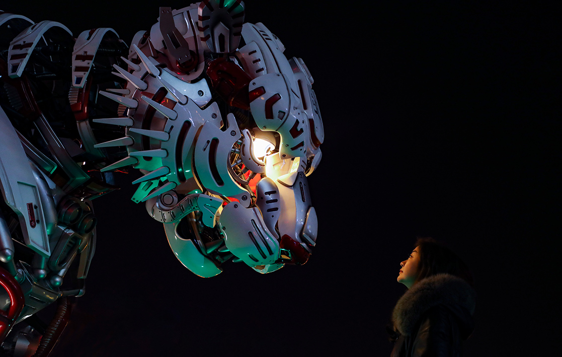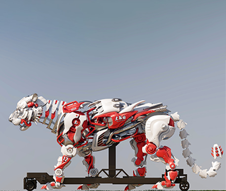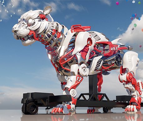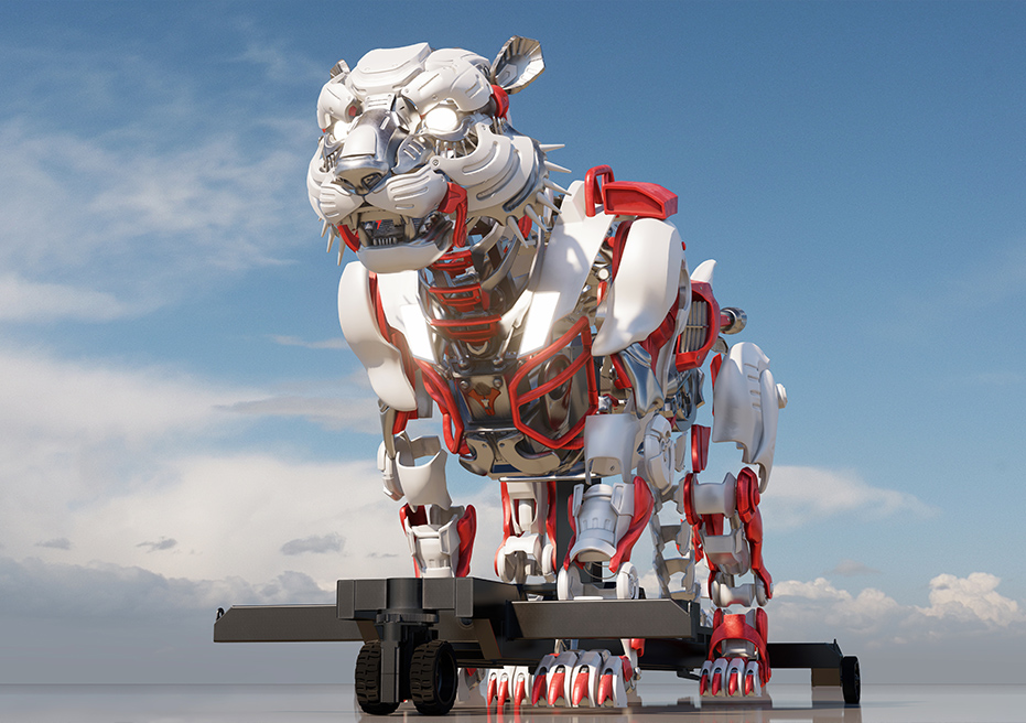 The Kinetic Tiger is a sci-fi mecha that perfectly combines the structural beauty of race cars and the mighty beauty of tigers. The white-red-silver palette infuses the installation with surging power and sportiness. With over 50 movable joints distributed on its torso, the 3.5m Kinetic Tiger is manipulated by two operators and driven by high-powered batteries.