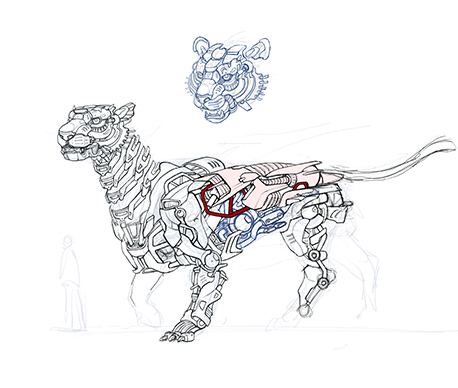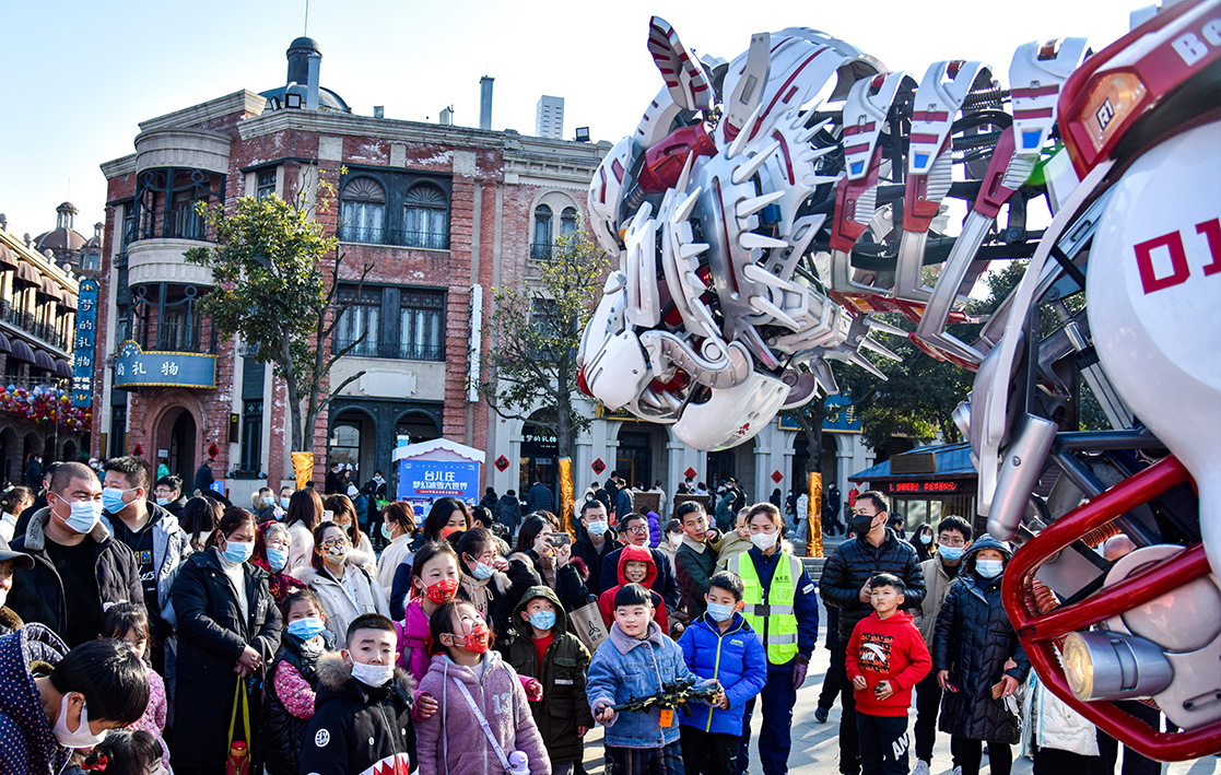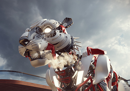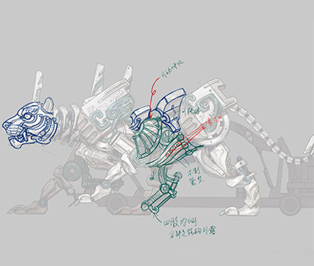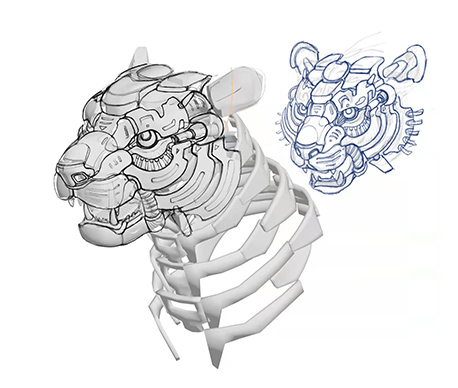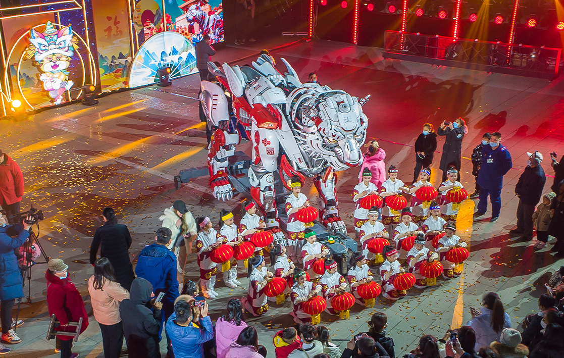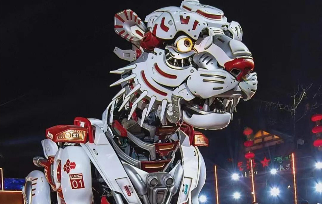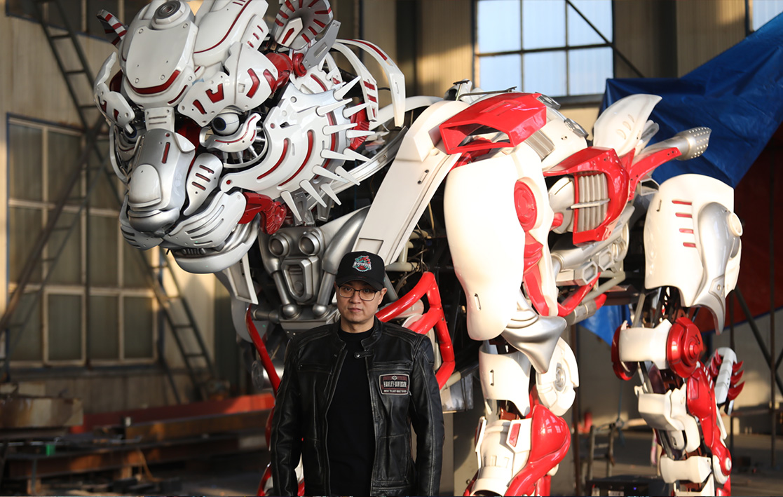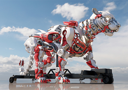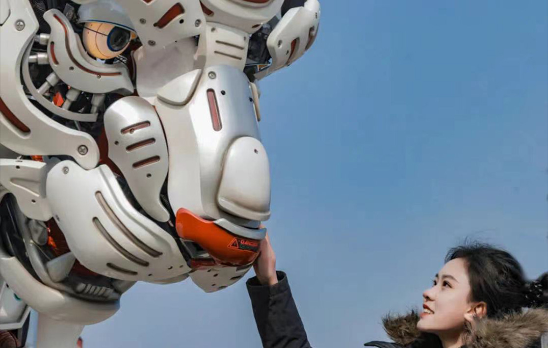 The Kinetic Tiger is a sci-fi mecha that perfectly combines the structural beauty of race cars and the mighty beauty of tigers. The white-red-silver palette infuses the installation with surging power and sportiness. With over 50 movable joints distributed on its torso, the 3.5m Kinetic Tiger is manipulated by two operators and driven by high-powered batteries.